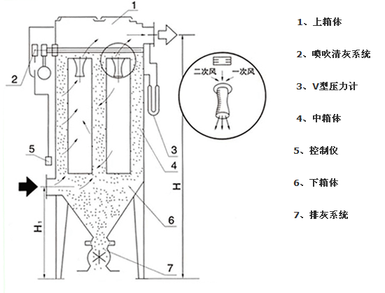 DMC單機除塵器由上、中、下箱體,排灰系統及噴吹系統五部分組成。上箱體包括可掀的蓋板和出風口;中箱體內有多孔板、除塵器骨架除塵器濾袋及文丘里管;下箱體由灰斗、進風口及檢查門組成;噴吹系統包括控制閥、脈沖電磁閥、噴吹管和氣包。